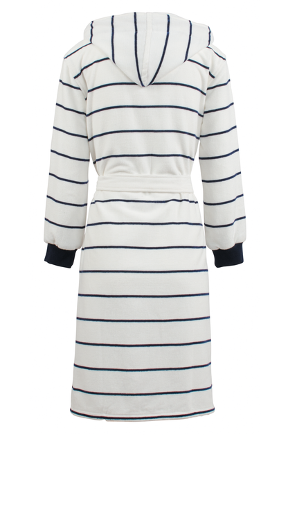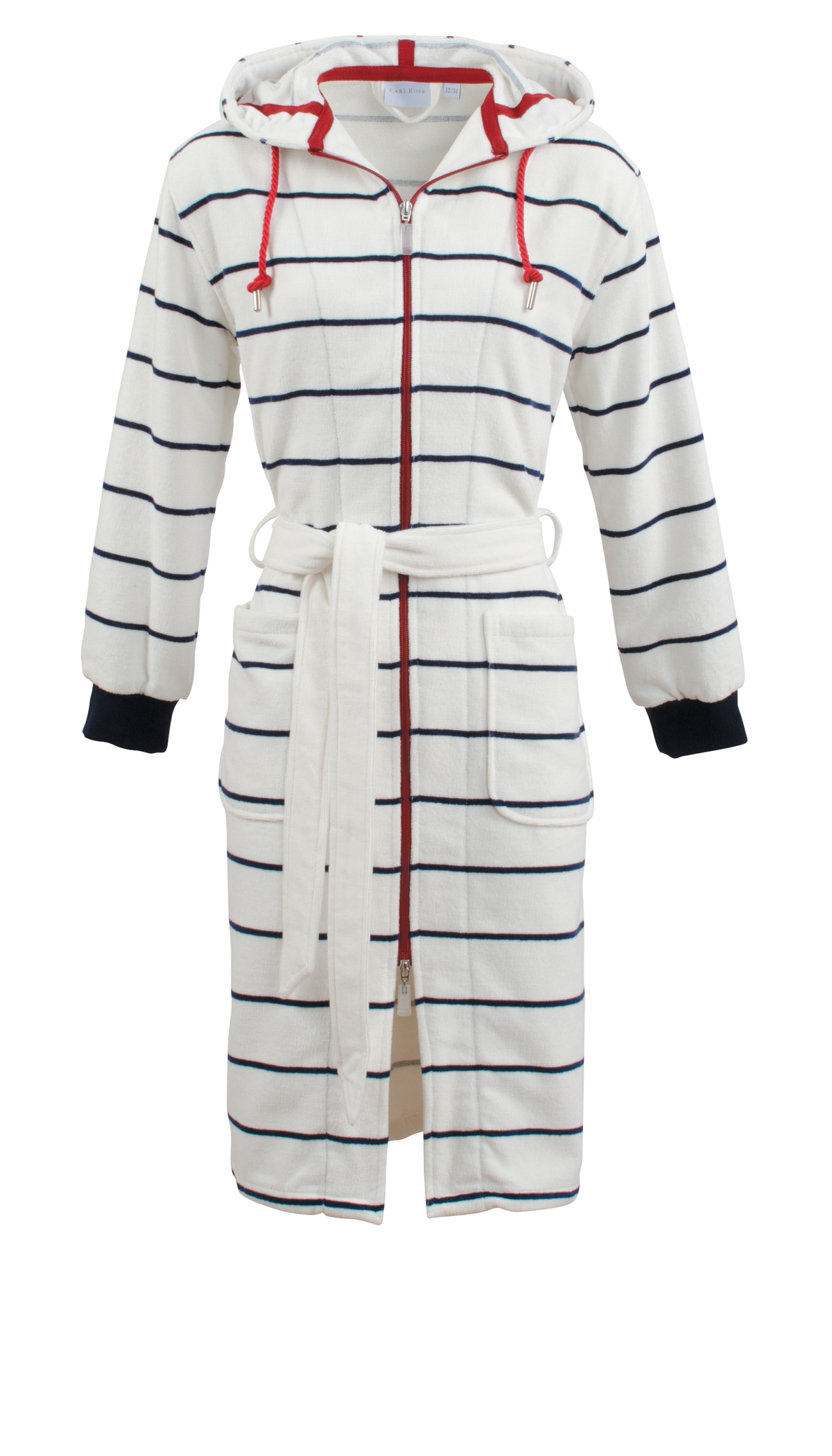 This sporty women's bathrobe features a hood and cuffed sleeves, crafted from lightweight, absorbent velour terry cloth. It falls to the knee and closes with a zipper and a drawstring inside the tunnel. Additional details include two patch pockets and an adjustable drawstring in the hood for a comfortable fit.