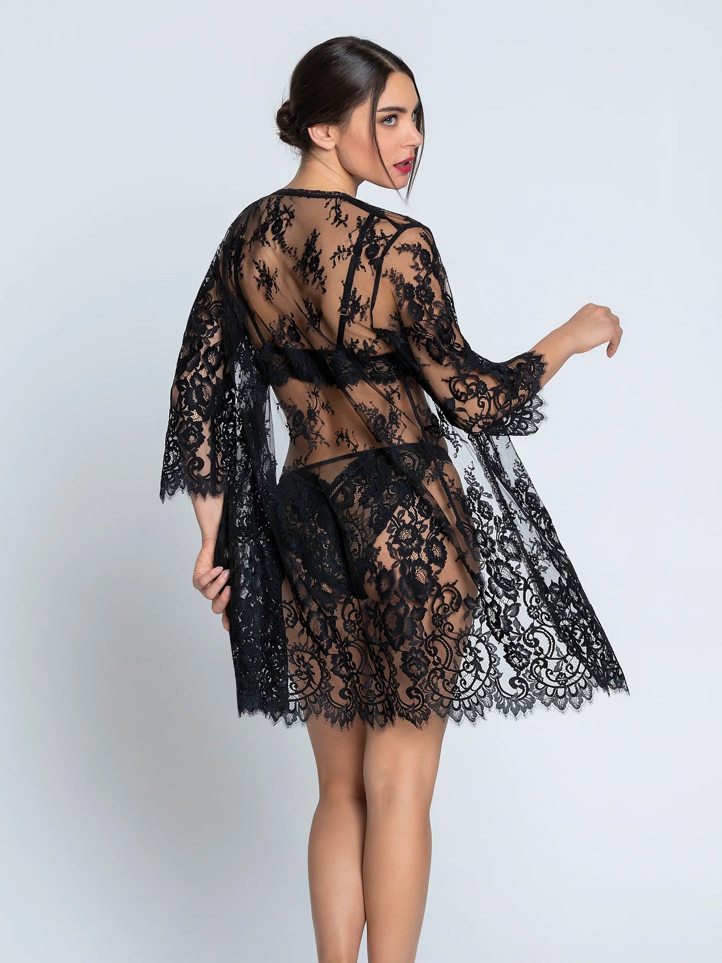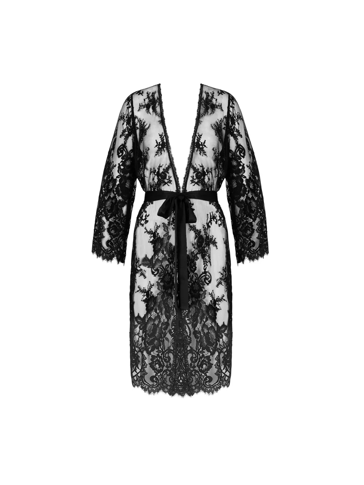 This timeless lace negligee from French designer Lise Charmel is made from jacquard lace with a Calais-Caudry® Leavers lace braid and silk satin belt. A classic straight fit with a V-neck and 3/4 sleeves.