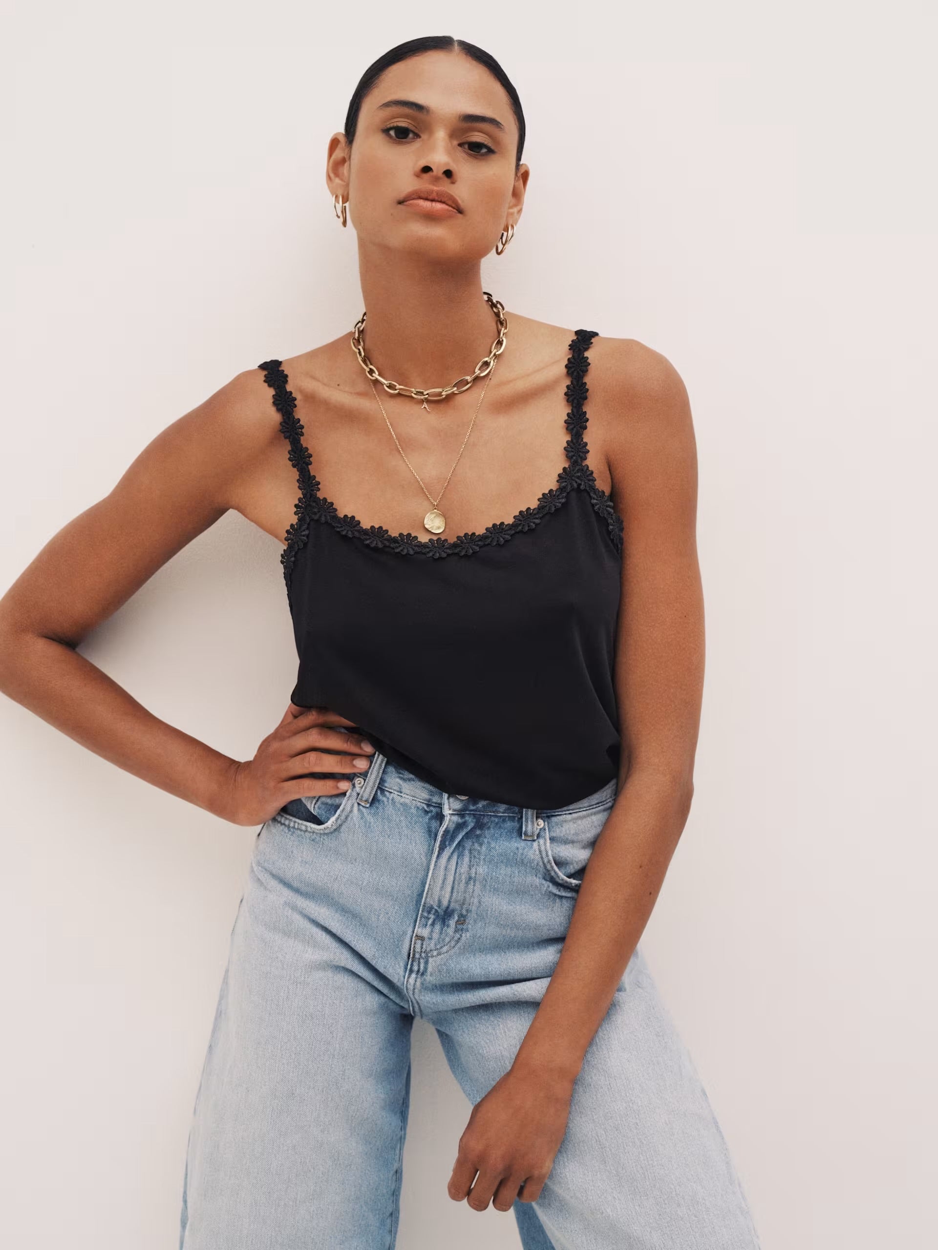 A feel good soft camisole featuring the famous Avero embroidered flower straps.