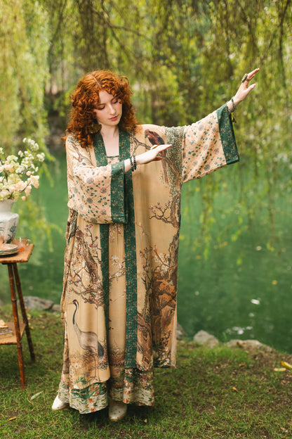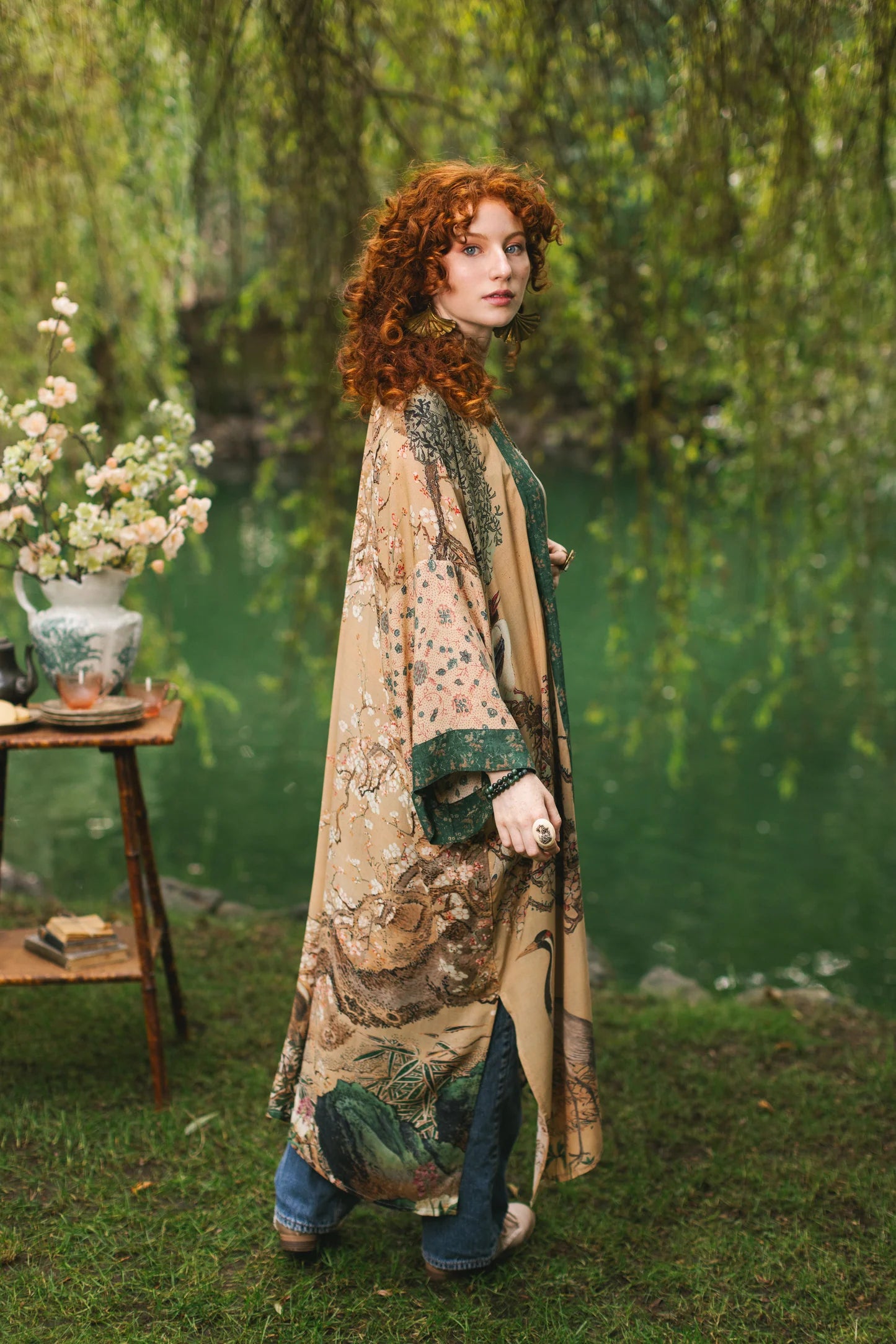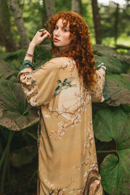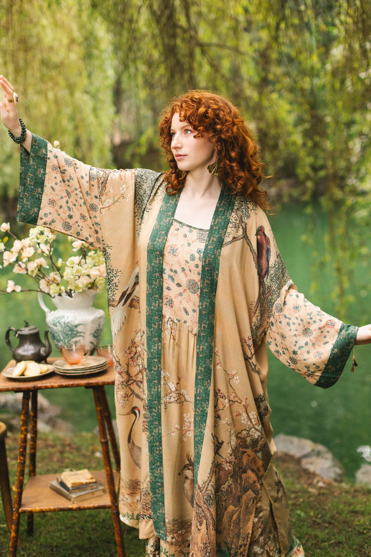 We are the heroes of our own story… so make yours exquisite! This captivating print is a blend of the classic and the fanciful (just like all good stories), and was created using artwork spanning more than three centuries. We layered two stunning 18th century ink-on-silk hanging scrolls from Japan painted with wild plum blossoms, peach trees, magpies, and a luminous moon to create this design, then added other whimsical elements — including Flemish antique illustrations of wild deer, birds, and cranes. The printed trim comes from French silk embroidery fragments from the early 1800’s, and the charming pattern on the sleeves is a replica of block-printed French paper from the same era. The result is chic, romantic and timeless — and tells a beautiful tale without saying a word ;)