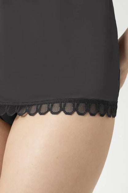 Our camisole in the color Thunder Grey from the Poetry Temptation collection ensures you're well-dressed while not compromising on comfort. The Poetry Temptation collection is a true highlight. The dazzling lace in its color combinations gives this lingerie collection a unique allure. With a particularly high viscose content (93%), the camisole features a glossy finish and a uniform appearance. The homewear shirts are Oeko-Tex® Standard 100 certified. By choosing this product, you are consciously supporting certified toxin-free textiles