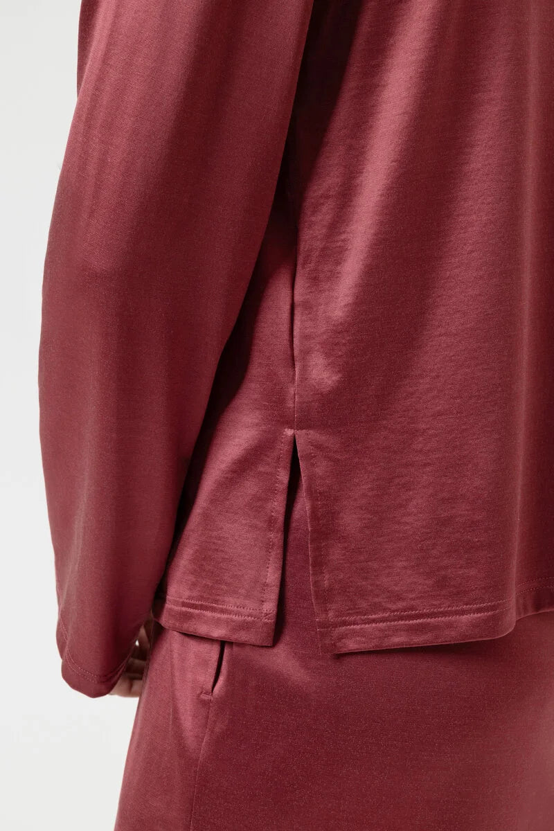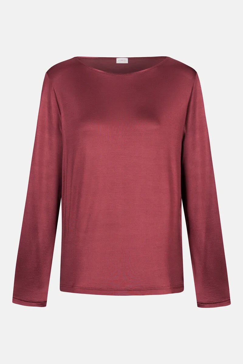 This long-sleeved shirt in Beau Bordeaux from the Pure Shine series is a great must-have. Thanks to 57% viscose, this long-sleeved T-shirt is very moisture-regulating, comfortable to wear and easy to wash. The warm, dark red tone gives this simple shirt a particularly elegant touch. For an everyday look, the shirt can be combined perfectly with matching trousers. The tops are Oeko-Tex® Standard 100 certified, which means you are making a conscious choice for textiles that have been tested for harmful substances.