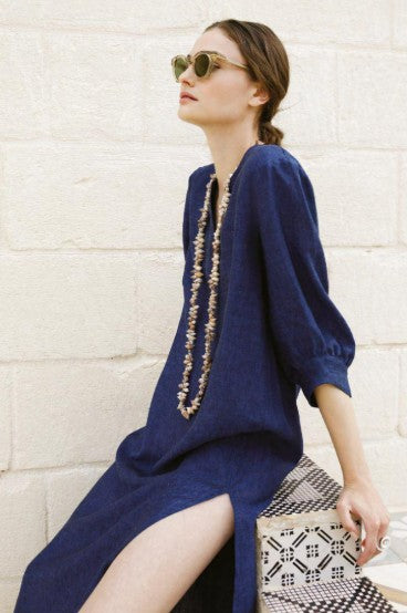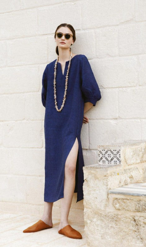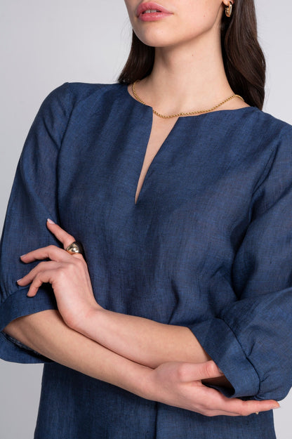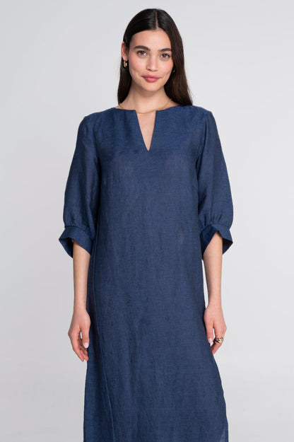Dress with a kaftan-style neckline and softly gathered balloon sleeves, finished with cuffs.
