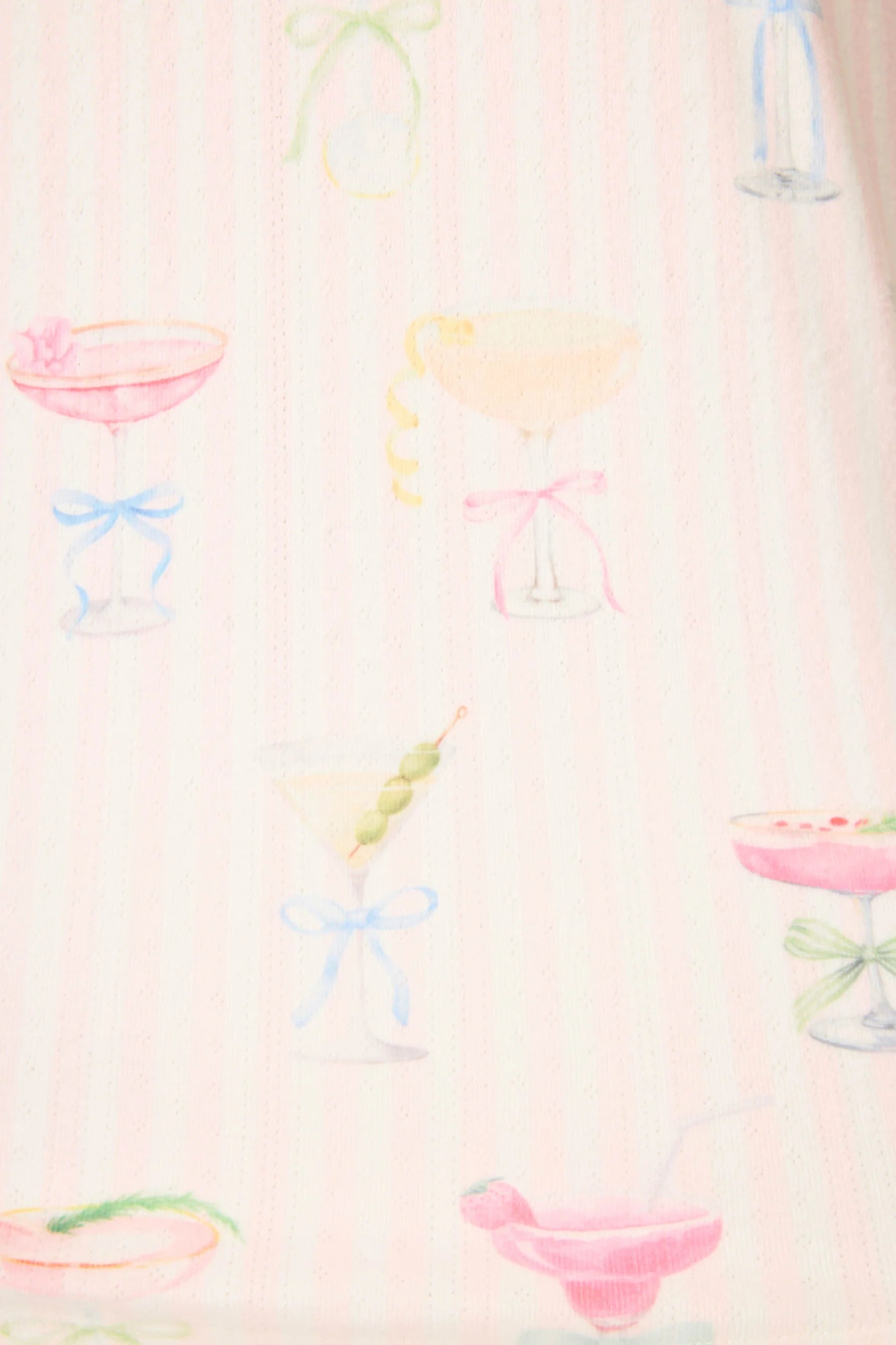 - Full-length PJ pant with cocktail print on pink-and-white striped pointelle.