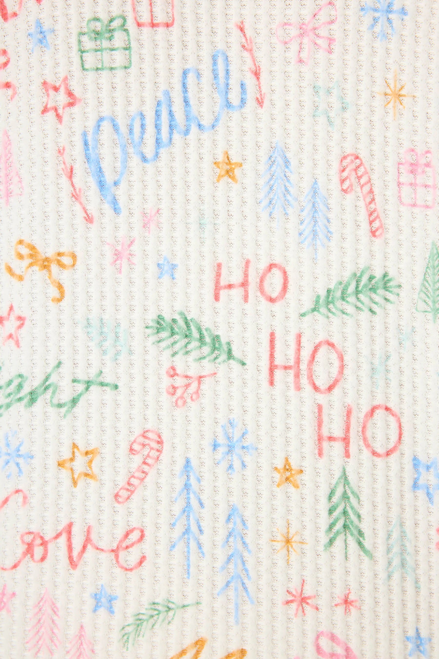 Women’s ivory brushed thermal pajama set with colorful holiday lettering, long-sleeve henley top with red buttons, jogger pants with red tie, and rainbow-striped cuffs.