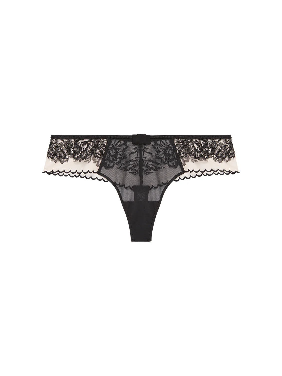 - Embroidered back with scalloped finishes on the curves of the buttocks.