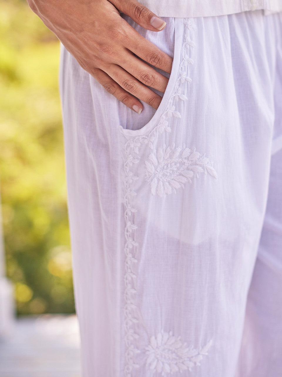 A white cotton dream of a design with hand-guided botanical-inspired embroidery, side seam pockets, and a wide elastic waistband.