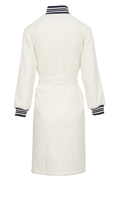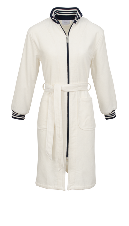 This sporty women's bathrobe features cuffed sleeves, crafted from lightweight, absorbent velour terry cloth. It falls to the knee and closes with a zipper.
