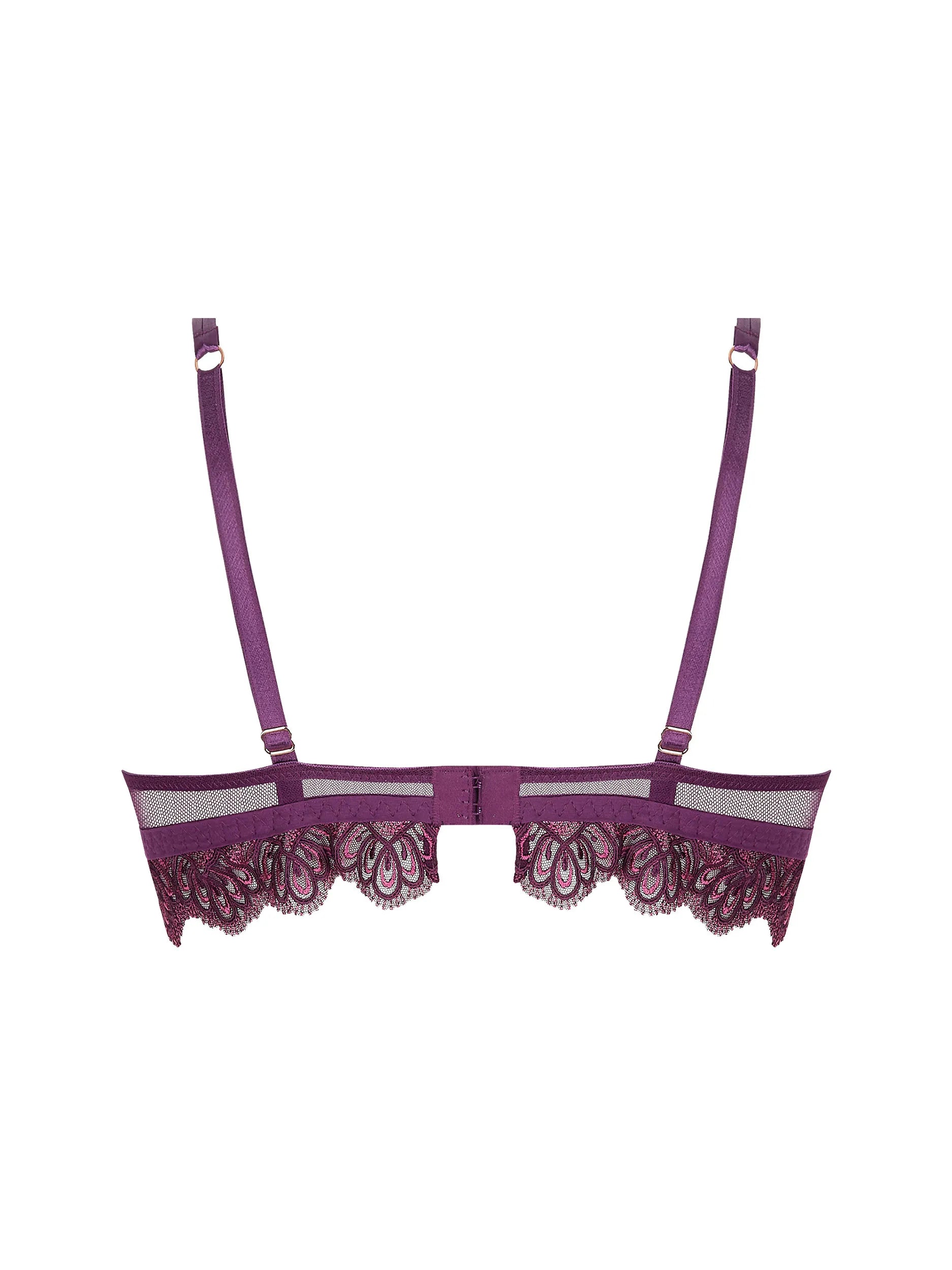 Upper cup in scalloped embroidery. Lower cup in matching embroidered fabric. Basque in tulle with scalloped embroidery. Center gore in tulle with jeweled rings at the strap bases and center gore.
