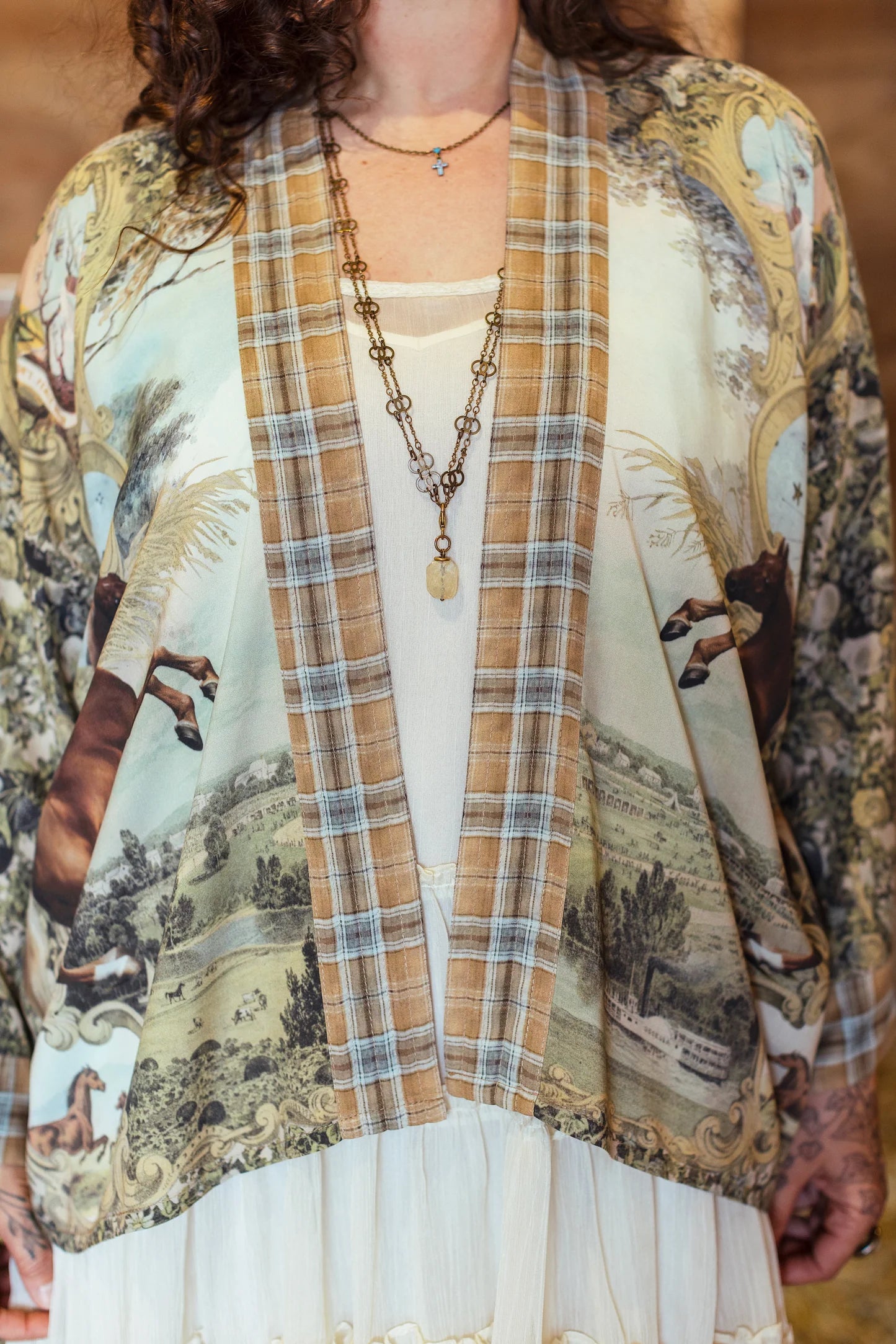 Created to celebrate the unbridled spirit of adventure, Born to Run blends vintage-washed, heritage prints with the untamed energy of two rearing racehorses by British painter George Stubbs. The antique banners, etched with mottos of rebellion like “Don’t Fence Me In”, are our spirited nod to the wild west and the open road. The beautiful, airy backdrop behind the horses is actually a scenic lithograph from the 1897 World’s Fair, and the faded florals and golden wheat were taken from an 1800’s farmers diploma. The pen-and-ink stars and upturned horseshoe are also antique drawings from the same era. And as a final, playful touch, we added a prancing mother horse and foal — a symbol of unbound freedom and joy. The whole design is trimmed in a washed heritage plaid, reminiscent of sun-faded chambray and days at home on the range :)