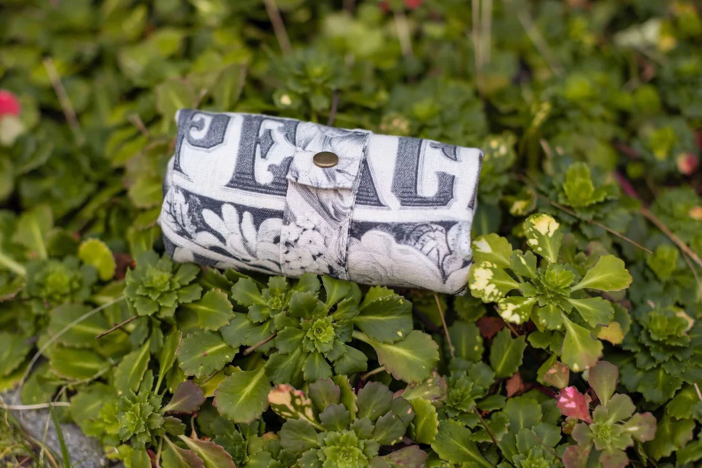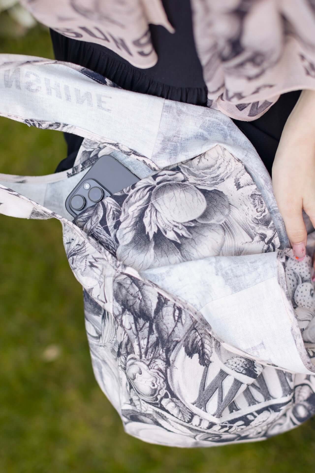 We have a deep appreciation for the simplest pleasures: the sun on our faces, a glass of wine shared with friends. This tote bag is a simple pleasure too — created using a cool collage of botanical prints and lithographs from the late 1800’s. It’s trimmed on the shoulder straps using a stunning heritage font that we reconstructed to spell out our grocery list of needs: peace, wine and sunshine baby!
