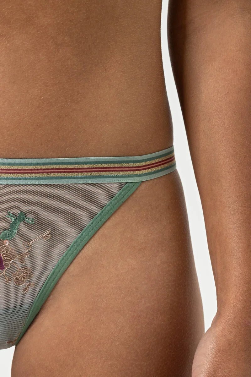 The string in Peat Moss from the Poetry Zap Zarapp series is an indispensable highlight. The fine elastic waistband and the artistic embroidery on delicate mesh give the string a feminine, elegant look. Together with the bralette from the series, it creates a lingerie set that is guaranteed to turn heads. Our thongs are Oeko-Tex® Standard 100 certified, which means you are consciously choosing textiles that have been tested for harmful substances.