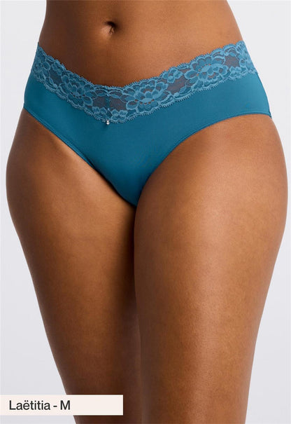 The perfect panties for low-cut jeans, our super soft microfiber Hipster hugs your curves in all the right places. This playful cut with moderate coverage has a pretty floral lace overlay at the hip and pairs perfectly with any of our lace or microfiber bras.