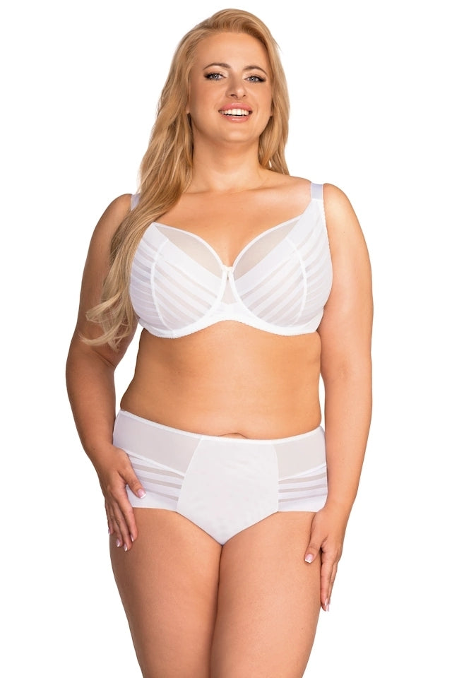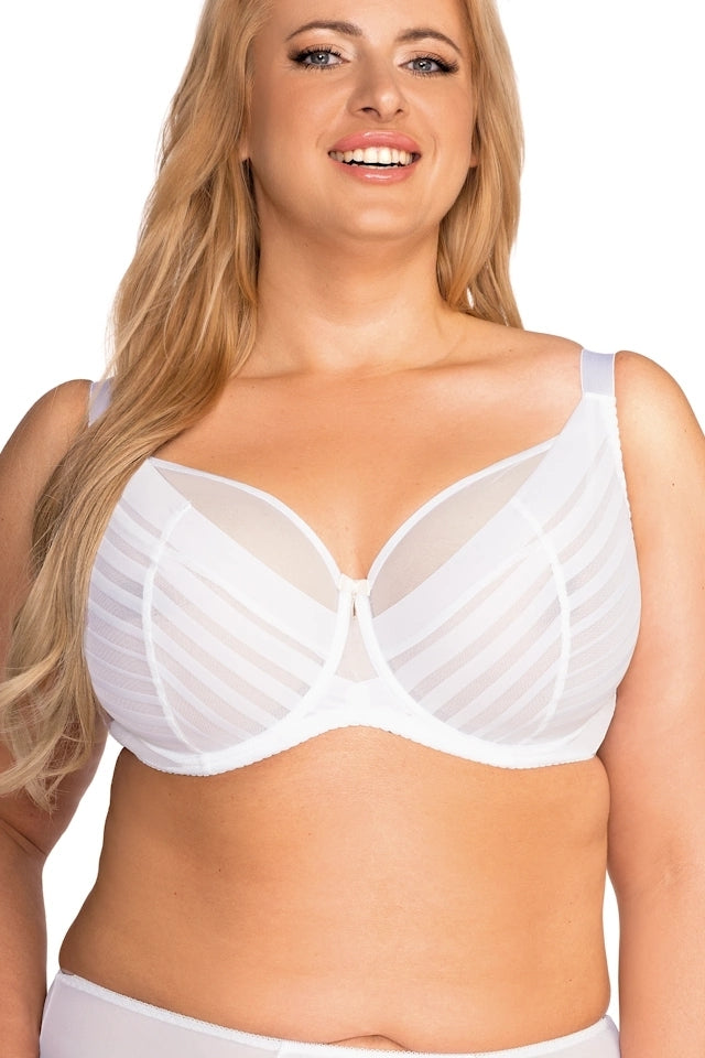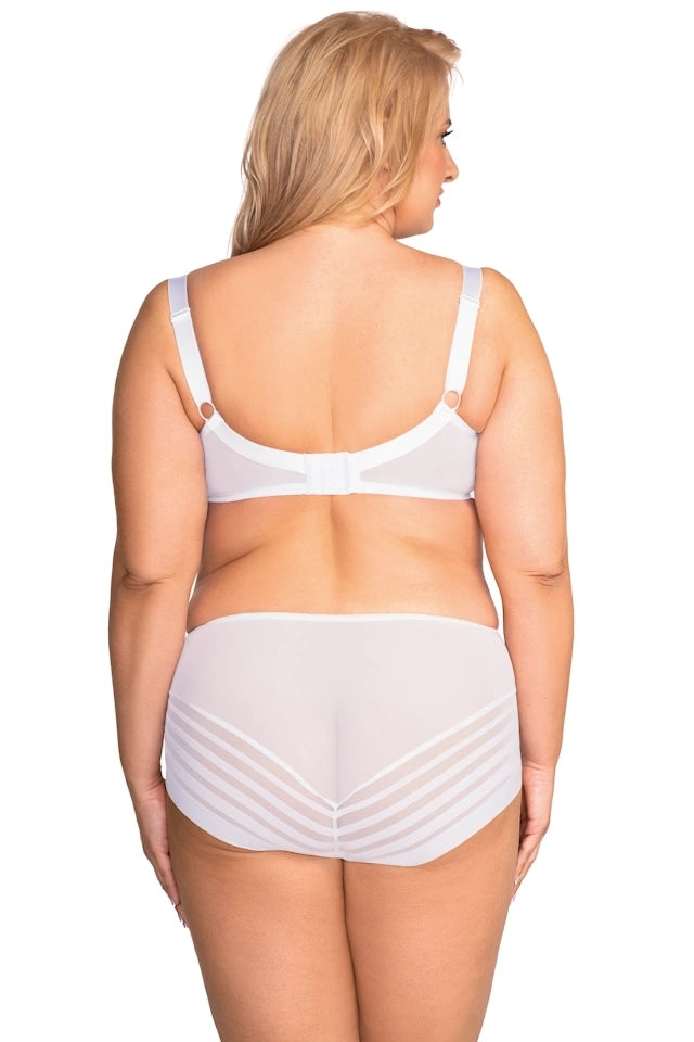 Alizee is an underwired, non-padded soft cup bra. It has double layered cups. The three part inner cups is made of mesh. The outer cups is made of striped mesh with only one vertical seam and the cup goes above the horizontal seam of the inner cup leaving the top part of the inner cup showing a little. This style gives you even more forward projection and nice lift. Simple powermesh back. Fully adjustable straps.