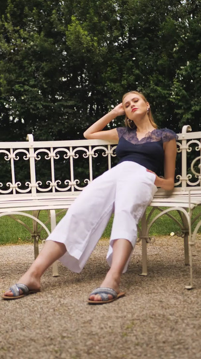 Crafted in Italy with 100% ribbed cotton, our Oscalito V Neck Tank is the perfect blend of luxury and practicality. The wide lace detail adds a touch of elegance to this essential piece, making it a must-have for any wardrobe. Experience the comfort and style of Oscalito.